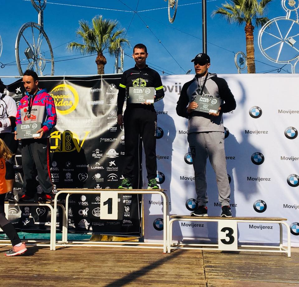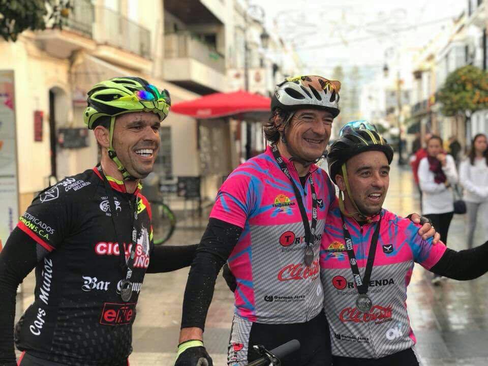 Carrera muy muy muy rápida (ya veníamos a eso), esta vez tuve la suerte de engañar a un buen amigo “Manuel Cordero Soriano” para que me acompañara en esta humilde locura, ya en la salida la cosa pintaba bien, pero empezaron a llegar galgos más finos que un lápiz y a ocupar las primeras posiciones (manuel me miraba y suspiraba, yo me reía jejejeje ) Tomamos la salida neutralizada y ya el ritmo era de 22 km/h, así durante 1,5 km. Después el tiempo lo dice todo, carrera rapidísima, siempre entre los 8 primeros, en el km 16 decido bajar ritmo y me descuelgo, hay aparece DON Manuel Cordero Soriano, que me dio su rueda durante 3 km dejándose la piel y toda su fuerza para que no me despegara de la cabeza (gracias gracias y gracias), vuelvo ha enganchar al grupo de cabeza y ya hasta meta, donde la llega era por asfalto y estaba muy mojado, sabía que si entraba primero del grupo que perseguíamos a los tres primeros en Sanlucar no tendrían huevos de pasarme, al final 4º de la general y muy muy contento.